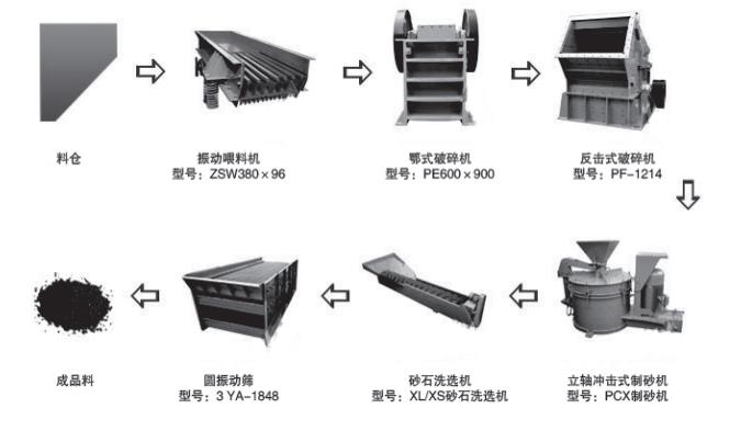 5.主機配置:振動喂料機、鄂式破碎機、反擊式破碎機、立軸沖擊式制砂機、圓振動篩、砂石洗選機等系統(tǒng)組成。